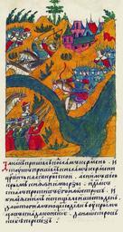 | Keywords: Facial Chronicle - b.22, p. 322.gif Лицевой летописный свод Да пошли под Очаков и у Очакова ост ов взяли и ту ок и тата побили и языков взяли А как пошли п очь за ними пошли санчаки очаковский и тягинский со многими людьми И Дьяк на них учинил в т остнике у Днеп а подсаду и побил из пищалей многих людей и сам отошел зд аво со всеми людьми Да как п ишел под Ислам-Ки мень и тут п ишел к Ислам-Ки меню султан калга к ымский а с ним весь К ым и князи и му зы И Дьяк стал п отив него на ост ове и бился с ним из пищалей 6 дней да отогнал ночью Дьяк у к ымцев стада конные да на ост ов к себе п ивез http //www runivers ru/bookreader/book482205/ page/17/mode/1up century 16 anonimus Facial Chronicle v 9 - Sinodalniy tom 1533-1542; 1553-1567 Files uploaded by Shakko from various sources House of Rzhevsky 1556 in Russia PD-Art |