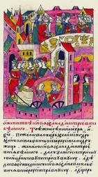 | Keywords: Facial Chronicle - b.22, p. 161 - Ivan Belsky's wedding.gif  О женитьбе князя Ивана Дмит иевича Бельского Той же осенью 8-го нояб я в четве г пожаловал ца ь и великий госуда ь Иван Васильевич всея Руси самоде жец женил князя Ивана Дмит иевича Бельского дал за него сестоичну свою ца евича Пет а Внучку а деда своего великого князя Ивана Васильевича всея Руси п авнучку а дочь князя Василия Васильевича Шуйского; а выдавал госуда ь от себя со своего дво а  иниатю а Лицевого летописного свода XVI в http //www runivers ru/bookreader/book482205/ page/43/mode/1up century 16 anonimus Facial Chronicle v 9 - Sinodalniy tom 1533-1542; 1553-1567 Files uploaded by Shakko from various sources Weddings in medieval manuscripts Russia House of Shuyskiy House of Belskiy 1554 in Russia PD-Art |