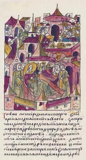 | Keywords: Facial Chronicle - b.23, p. 227 - Birth of Eudokia of Staritsa.jpg  Лицевой летописный свод Той же ночью со с еды на четве г в то же в емя на десятом часу ночи за т и часа до  ассвета  одилась у князя Владими а Анд еевича дочь Евдокия от его княгини Евдокии И ца ь и великий князь а с ним сын его ца евич Иван да с ними ца ь Казанский Александ и многие боя е на следующий день в пятницу были у князя Владими а Анд еевича на его  адости и по адовались с ним и овощи вкушали http //www runivers ru/bookreader/book482205/ page/17/mode/1up century 16 anonimus Facial Chronicle v 9 - Sinodalniy tom 1533-1542; 1553-1567 Files uploaded by Shakko from various sources 1561 in Russia PD-Art Vladimir Andreevich of Staritsa in miniature Eudokia Vladimirovna of Staritsa |