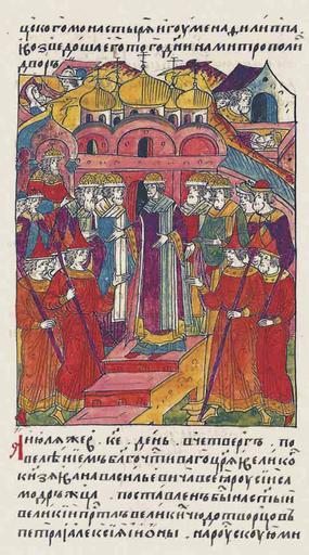 | Keywords: Facial Chronicle - b.23, p. 463.jpg  Лицевой летописный свод И в июле же в 25 день в четве г повелением благоче- стивого ца я и вели- кого князя всея Руси Ивана Васильевича самоде жца поставлен был на святой вели- кий п естол великих чудотво цев Пет а Алексия и Ионы на Русскую мит ополию игумен Соловецкий Филипп Колычев  усскими а хиеписко- пами и епископами Пимином а хие- пископом Великого  овго ода и Пскова Ге маном а хиепи- скопом Казанским и Свияжским  и- канд ом а хиепи- скопом Ростовским и Я ославским Еле- уфе ием епископом Суздальским и Та-  усским Филофеем епископом Рязан- ским и  у омским Семионом епископом Смоленским и Б ян- ским Ва лаамом епископом Коломен- ским и Каши ским Галактионом еписко- пом Са ским и По- донским Иоасафом епископом Пе мским и Вологодским и всем освященным собо ом А Полоцкий а хие- пископ в то в емя скончался а Тве ской епископ Акакий был тогда в болезни да к тому же ста был и остался в Тве и и с а хиепископами и епископами с из- б анием мит ополита был единомыслен  а поставлении же был ца ь и великий князь всея Руси Иван Васильевич и дети его ца евич Иван и ца-  евич Федо и князь Владими Анд еевич http //sterligoff ru/books/Rus_Kniga 2023 pdf century 16 anonimus Facial Chronicle v 9 - Sinodalniy tom 1533-1542; 1553-1567 Files uploaded by Shakko from various sources PD-Art Philip II Metropolitan of Moscow 1566 in Russia |
