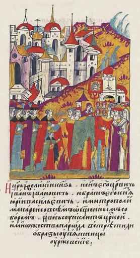 | Keywords: Facial Chronicle - b.23, p. 042.jpg И ца ь и великий князь и его сын ца евич Иван Иванович и его б ат князь Ю ий Васильевич и мит ополит ака ий со всем освященным собо ом и весь ца ский синклит и множество на ода вст етили иконы у це кви Пятницы Ржевской http //www runivers ru/bookreader/book482205/ page/17/mode/1up century 16 anonimus Facial Chronicle v 9 - Sinodalniy tom 1533-1542; 1553-1567 Files uploaded by Shakko from various sources PD-Art Ivan Ivanovich Yuri of Uglich 1532-1563 in miniature Macarius of Moscow |