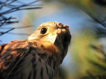 Keywords: falcon kestrel bird brown feather portrait head beak eye predator look perched