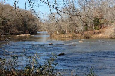 Keywords: fall autumn river nature trail gate wood outdoor serene tranquil vacation