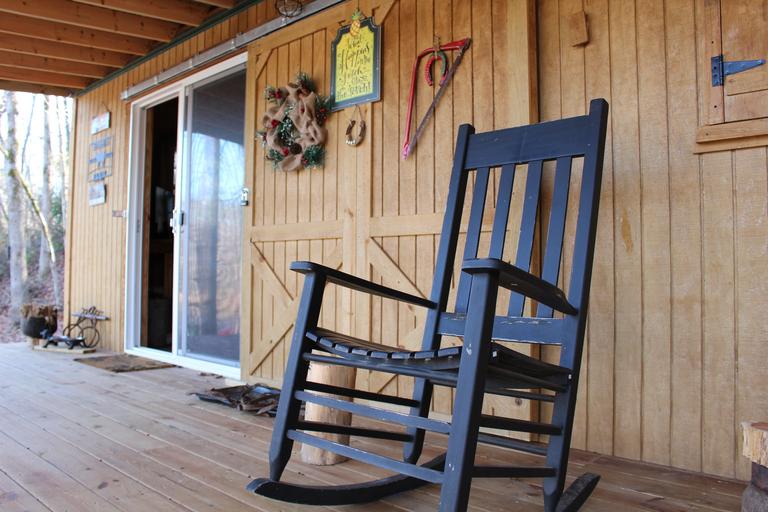 Keywords: fall autumn river nature trail gate wood outdoor serene tranquil farm peaceful lifestyle relaxation vacation camping cabin porch rocking chairs recreation