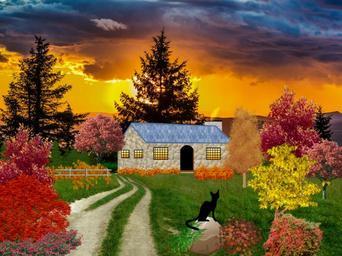 Keywords: fall house trees sky nature clouds leaves landscape trail colors black cat autumn landscape autumn leaves field