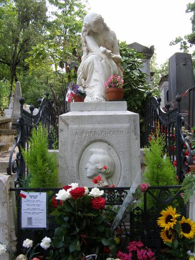 | Keywords: falls frédéric chopin cemetery father lachaise paris france birth-death 1810-1849 sad woman statue crying highly visited monument work of auguste clésinger opened in 1850 a historical monument burial tombstone tomb sculpture fall flowers tree shrub bouquet of flowers red and white roses flower |