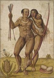 | Keywords: Familia Tupinamba.jpg en Tupinamba Indian man woman and child; the man holds a bow and arrows and wears a neck-ornament the baby in a sling various fruit depicted in the foreground Pt Familia de idios Tupinamba o homem possui um arco e flechas e usa um ornamento no pescoço frutas diversas representadas em primeiro plano 2011-08-19 http //topbloger livejournal com/6450993 html John White PD-old-100 Uploaded with UploadWizard Tupí people Old images of Indigenous peoples of Brazil John White |