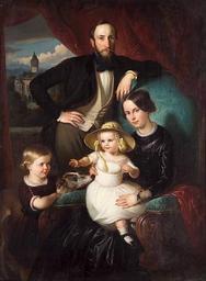 | Keywords: Familie von Cramm vor Schloss Oelber.jpg Familie von Cramm vor Schloss Oelber A portrait of the von Cramm family with the family home Schloss Oelber in the distance Oil on canvas 174 x 129 cm According to the inscription that was transcribed from the original canvas the sitters are Adalbert von Cramm 1818-1851 his wife Mechthilde von Cramm née Countess Veltheim 1825-1874 and their children Edgar 1846-1909 and Herta born 1847 Edgar was the grandfather of w Gottfried von Cramm 1909-1976 the well-known tennis player http //www bonhams com/ Bonhams ~ 1850 anonymous PD-old Images from Bonhams Family portraits 1850s paintings Biedermeier portrait paintings Schloss Oelber Armchairs in portrait paintings Cramm family |