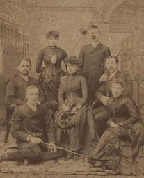 | Keywords: group portraits groupportraits groupshot people monochrome surreal Photographer: Reuben R. Sallows (1855 - 1937) Description: Group portrait of three women and four men, full-length, facing front; man seated on floor on right wears long, dark double-breasted suit coat, pants, white shirt, holds a walking stick that extends across centre of frame; woman seated in centre wears dark long-sleeved, high-necked dress with single row of buttons to waist, velvet ribbons tied across skirt; painted backdrop; Sallows imprint across bottom of photocard; writing across bottom identifies subjects: Back row - F. McLean, Jack Acheson; Middle row - Rev. T.B. Walwyn, Annie Downing, H. Wigle; Bottom row - W.D. Cox, Emma Cox Object ID : 0507-rrs-ogohc-ph View additional photographs by Sallows that are held in other collections at the Reuben R. Sallows Digital Library. Order a higher-quality version of this item by contacting the Huron County Museum (fee applies). Photographer: Reuben R. Sallows (1855 - 1937) Description: Group portrait of three women and four men, full-length, facing front; man seated on floor on right wears long, dark double-breasted suit coat, pants, white shirt, holds a walking stick that extends across centre of frame; woman seated in centre wears dark long-sleeved, high-necked dress with single row of buttons to waist, velvet ribbons tied across skirt; painted backdrop; Sallows imprint across bottom of photocard; writing across bottom identifies subjects: Back row - F. McLean, Jack Acheson; Middle row - Rev. T.B. Walwyn, Annie Downing, H. Wigle; Bottom row - W.D. Cox, Emma Cox Object ID : 0507-rrs-ogohc-ph View additional photographs by Sallows that are held in other collections at the Reuben R. Sallows Digital Library. Order a higher-quality version of this item by contacting the Huron County Museum (fee applies). |