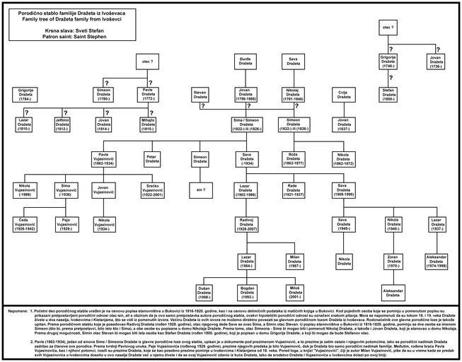 Keywords: Family tree drazeta ivosevci.png Porodično stablo familije Dražeta iz Ivoševaca / Family tree of Dražeta family from Ivoševci Ja sam autor / I am author Family trees of Serbia Family trees of Croatia 2013-07-22 own assumed РД~commonswiki Cc-zero Literatura / Sources 1 Matične knjige u Bukovici delimični podaci 2 Popis stanovništva u Bukovici iz 1816-1820 godine 3 Porodično stablo koje je izradio Radivoj Dražeta rođen 1928 godine 4 Knjiga Vujasinovići autor Milan Vujasinović 5 Knjiga Antroponimija Bukovice autor Živko Bjelanović Split 1988 |