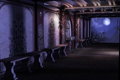 Keywords: fantasy digital render scene garden alcove bench rest night moon moonlight