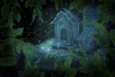 Keywords: fantasy dwarf dwarf house light lights background photo effect road leaf leaves dream mood blue green composing