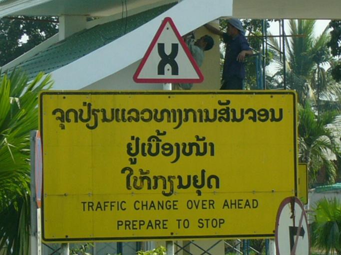 | Keywords: Fari-Wechsel.jpg Vientiane Laos Change of Traffic direction in road transport symbol and text sign at the Thai-Lao border ” Thai “Lao Friendship Bridge ” Vientiane with right hand traffic †’ Nong Khai with left hand traffic This sign is posted on the Laotian side just in front of the bridge The border is further ahead but the border control is done here A few meters ahead there is a traffic light regulating the crossing of sides junction The picture shows a very rare traffic sign X Verkehrszeichen zur bevorstehenden Ă„nderung des Fahrtrichtungswechsels im StraĂźenverkehr Laos mit Rechtsverkehr †’ Thailand mit Linksverkehr an der Thai-Lao-FreundschaftsbrĂĽcke zwischen Vientiane/Laos und Nong Khai/Thailand d h noch vor der BrĂĽcke in Richtung Thailand own 2004-11-20 User Mattes Bilingual road signs Black on yellow signs Change of driving directions Laos Red and white signs Road signs in Laos Signs in Laos Thai-Lao Friendship Bridge Taken with Panasonic Lumix DMC-LC50 Work by Mattes 2004 User Mattes/Contributions/Topics/banners coat of arms flags logos seals and signs User Mattes/Contributions/Topics/Transport User Mattes/Contributions/Topics/Laos |