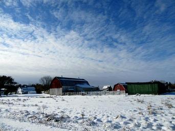 Keywords: farm barn rural country winter wintry snow outdoors field pasture meadow
