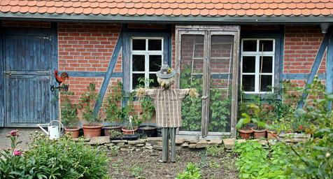 Keywords: farm scarecrow goal wooden gate old wood input bed blue wooden door home farmhouse window
