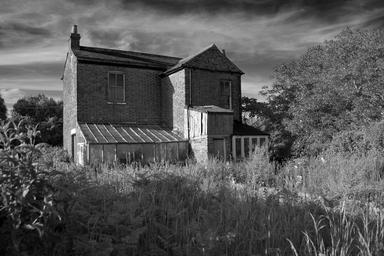 Keywords: farmhouse abandoned neglect dilapidation weed choked deserted dramatic sky black and white