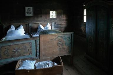 Keywords: farmhouse bedroom old hand-painted beds white linen subdued light wooden antique outdoor museum austria