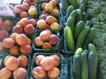 Keywords: farming produce peaches farmer's market cucumbers local organic fruit green outdoors vegetables
