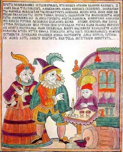 Keywords: Farnos the Red Nose and his wife Pegasya.JPG en Farnos the Red Nose and his wife Pegasya Russian humorous lubok ru Сценка в кото ой Фа нос и его жена Пигасья вст ечаются с целовальником Е маком Б ат целовальник не ты ли Е мак что носишь к асный валеный колпак Отдал бы я тебе поклон с хохлом Знавал ли ты Фа носа желаешь ли ты посмот еть к асного моего носа Жену мою Пигасью видал ли ты Вести такие п о нас слыхал ли ы собою хотя не богаты да имеем у себя носы го баты и хотя кажемся неп игожи да не носим на себе огожи а во хмелю бываем весьма угожи Вче ась мы здесь у тебя п ебывали и все г оши свои п огуляли тогда были пьяны и к асходу денег неуп ямы ыне с похмелья много мы имели воздыхати да п инуждены к тебе идти винца поискати и ты нас похмельных не моги оставити п икажи ендовку и пива поставити а мы вп едь готовы будем хоть деньгами платить или тебя жгутами молотить http //www argentium-book ru/forum/1923/1515_ЗАГАДОЧ ЫЙ_РУССКИЙ_ЛУБОК Anonymous folk artist century 18 PD-old-100 Lubok Jesters in engravings |