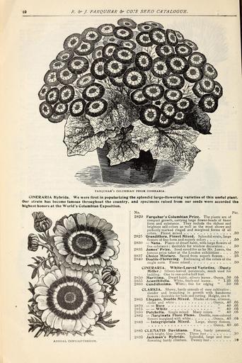 | Keywords: Farquhar's catalogue of seeds 1901 (15963419583).jpg R 5r»/ FARQUHAR CO 'S SEED CATALOGUE <br> FARQUHAR'S COLUMBIAN PRIZB CINERARIA <br> CINERARIA liybrida We were first in popularizing the splendid large-flowering varieties of this useful plant <br> Our strain has become famous throughout the country and specimens raised from our seeds were accorded the <br> highest honors at the World's Columbian Exposition <br> ANNUAL CHRYSANTHEMUM <br> No <br> 2820 <br> 2825 <br> Pkt <br> Farquhar's Columbian Prize The plants are of <br> compact growth carrying large flower-heads of finest <br> form and substance They include the richest and <br> brightest self-colors as well as the most showy and <br> perfectly marked ringed and margined forms of all <br> colors Finest mixed <br> Grandiflora Finest Mixed Splendid strain large <br> flowers of fine form and superb colors <br> 2830 ” Nana Plants of dwarf habit with large flowers of <br> fine substance ; desirable for window decoration <br> 2835 James' Prize Seed saved for us by Mr James the <br> famous prize taker at the London exhibitions <br> 2837 Choice Mixture Saved from superb flowers <br> 2840 Double Flowering Embracing all the colors of the <br> single sorts Finest mixed <br> CINERARIA White-Leaved Varieties Dusty <br> Miller Silvery-leaved perennials much used for <br> bedding One to one-and-a-half feet <br> 2850 Maritima Dwarf habit ; silvery leaves Ounce 50 05 <br> 2855 Acanthifolia White finelv-cut leaves 1 25 05 <br> 2860 Candidissima White; fine for edging 50 05 <br> CLARKIA Showy hardy annuals of easy cultivation ; <br> slender and branching in growth with handsome <br> flowers ; desirable for beds and cutting Height one ft <br> 2865 Elegans Double Mixed Shades of rose crimson <br> violet and white Ounce 40 05 <br> 2870 Rose 40 05 <br> 2875 White 40 05 <br> 2880 Pulchella Single mixed Many colors 40 05 <br> 2882 ” /larginata Flore Pleno Double rose-colored <br> flowers 'margined with white Ounce 40 05 <br> 2883 ” Integripetala Mixed Large showy flowers <br> ¢ Ounce 40 05 <br> 2885 CLEI1ATIS Davidiana Fine hardy perennial <br> with bright blue lowers Three feet 10 <br> 2895 Jackman's Hybrids Splendid large and free- <br> flowering hardy climbers Twenty feet 1§ 42284039 133538 66475 Text http //www biodiversitylibrary org/page/42284039 1901 10 5962/bhl title 66475 Henry G Gilbert Nursery and Seed Trade Catalog Collection ; R J Farquhar Company NameFound Acanthifolia NameFound Candidissima NameConfirmed Candidissima NameBankID 4102668 NameFound Chrysanthemum NameConfirmed Chrysanthemum EOLID 38388 NameBankID 2657422 NameFound CINERARIA NameConfirmed Cineraria EOLID 6258313 NameBankID 1674869 NameFound CINERARIA NameConfirmed Cineraria EOLID 6258313 NameBankID 4894724 NameFound Clarkia NameConfirmed Clarkia Pursh EOLID 38068 NameFound Davidiana NameFound Elegans NameConfirmed Elegans NameBankID 5116399 NameFound Grandiflora NameFound Integripetala NameFound Maritima NameFound Pulchella NameConfirmed PULCHELLA EOLID 6016096 NameBankID 4937452 Biodiversity Heritage Library Farquhar's catalogue of seeds 1901 plants bulbs fertilizers tools sundries / Garden Stories Bedding plants Boston Catalogs Equipment and supplies Flowers Gardening Massachusetts Nurseries Horticulture Nursery stock Perennials R J Farquhar Company Seeds U S Department of Agriculture National Agricultural Library bhl page 42284039 dc identifier http //biodiversitylibrary org/page/42284039 bhlGardenStories Cineraria Chrysanthemum BHLinbloom nurseries horticulture r j farquhar company u s department of agriculture national agricultural library bhlgardenstories bhlinbloom Information field Flickr posted date ISOdate 2015-02-19 Cineraria hybrida Petasites hybridus CC-BY-2 0 BioDivLibrary https //flickr com/photos/61021753 N02/15963419583 2015-08-24 02 54 02 cc-by-2 0 PD-old-70-1923 Bedding plants Petasites hybridus Farquhar's catalogue of seeds 1901 Photos uploaded from Flickr by Fæ using a script |