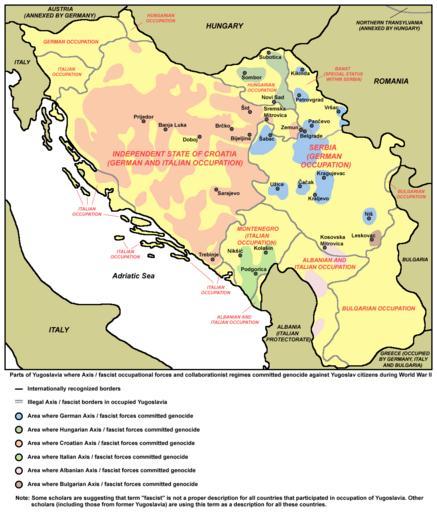 | Keywords: Fascist genocide in yugoslavia.png en Parts of Yugoslavia where Axis / fascist occupational forces and collaborationist regimes committed genocide against Yugoslav citizens during World War II sr Delovi Jugoslavije gde su fašističke okupacione snage i kolaboracionistički režimi počinili genocid nad jugoslovenskim građanima tokom Drugog svetskog rata own PANONIAN self-made map by user PANONIAN References Map is primarily based on this source Istorijski atlas Geokarta Beograd 1999 Other secondary sources Valter Manošek Holokaust u Srbiji Beograd 2007 Dr Tomislav Bogavac Nestajanje Srba Niš 1994 Aleksandar Veljić Racija - zaboravljen genocid Beograd 2007 Zvonimir Golubović Racija u Južnoj Bačkoj 1942 godine Novi Sad 1992 Dr Rajko Đurić - Mr Antun Miletić Istorija holokausta Roma Beograd 2008 http //www terra es/personal7/jqvaraderey/194145fc gif - Map of fascist Europe 1941-1945 http //www geschichteinchronologie ch/eu/jugoland/EncJud_juden-im-jugoland-03-holocaust-1941-1944-ENGL html - Jews in Yugoslavia 03 Holocaust 1941-1944 http //www open ac uk/socialsciences/semlin/sr/holokaust-u-srbiji php - Holokaust u okupiranoj Srbiji http //www srbijazemljaheroja com/1942pokoljsrba jpg d0ba18007da72ef3499d41a38736ae9b 5dce22d7b1bb0904b38d5710535f03a9 - Map of massacre over Serbs 1941-1942 http //www makabijada com/dopis/images/slike/RACIJA pdf - Istina o Novosadskoj raciji http //www krajinaforce com/dokumenti/genocid_u_jugoslaviji_smilja_avramov pdf - Smilja Avramov Genocid u Jugoslaviji 1941-1945 http //books google com/books id hq3XLZ9Nw68C pg PA126 lpg PA126 dq backa+raid+1942 source bl ots OkApnewFTW sig x4KIpKOz_UI3GskXQMzbdeItByw hl sr ei LRLATJu0KYrMswaO3IHZCA sa X oi book_result ct result resnum 9 ved 0CDYQ6AEwCA v onepage q backa 20raid 201942 f false - Lajco Klajn The past in present times - The Yugoslav saga Encyclopedia of the Holocaust s v Bačka http //books google de/books ei 6gK_TKvUK8KgOtfuxUc ct result id sikYAAAAIAAJ dq 22Encyclopedia+of+the+Holocaust 22+Backa q Backa search_anchor Barry M Lituchy Jasenovac and the Holocaust in Yugoslavia Jasenovac Research Institute 2006 ISBN 0975343203 9780975343203 p xxx-xxxi http //books google de/books ei AgS_TLCDHdDBswbUnKCKBA ct result id lvAhAQAAIAAJ dq Backa+Jews+genocide q hungarian+fascists search_anchor Maps of Yugoslavia during World War II Maps of Serbia during World War II Maps of Montenegro during World War II Maps of the Independent State of Croatia Maps of the history of Vojvodina Maps of the history of Banat Maps of the history of Bačka Maps of the history of Syrmia Maps of the history of Republika Srpska Maps of the history of the Republic of Macedonia in modern times Maps of the Holocaust The Holocaust in Yugoslavia War crimes Banat 1941-1944 |
