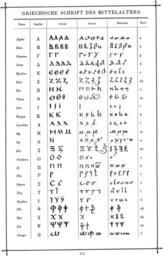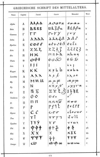 | Keywords: FaulmannBuchDerSchriftPage171.png Page 171 from Carl Faulmann Das Buch der Schrift 2nd edition Wien Vienna 1880 I have scanned the page at rather high resolution so it should be possible to print it in reasonable quality 300 ppi at more or less 100 of the original size This page from Faulmann ™s book shows the Griechische Schrift des Mittelalters i e Greek medieval script letters the uncial a cursive and the minuscle type as used in old manuscripts For a biography of Carl Faulmann see the German Wikipedia Scanned by Aristeas from his own copy of the book PD-old Greek alphabet Alphabet charts Das Buch der Schrift Faulmann |