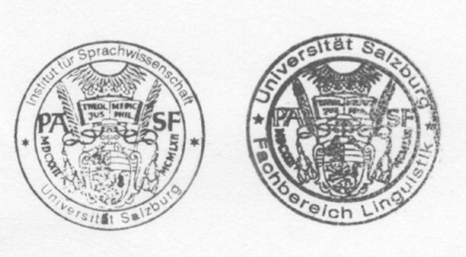 Keywords: FB Linguistik - Stempel.tif University of Salzburg Austria Universität Salzburg own Eweht 2012-10-28 Universität Salzburg Rubber stamp imprints Seals of Salzburg Cc-zero