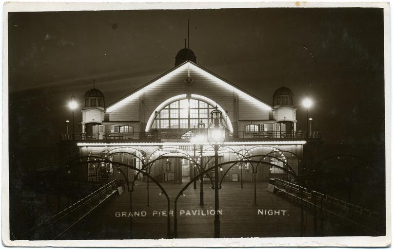 | Keywords: FCP HB006.jpg Postcard of the Grand Pier Pavilion Herne Bay Kent illuminated on the night of its grand opening by the Lord Mayor of London on 3 August 1910 Original photograph by Fred C Palmer also appeared in the defunct newspaper Herne Bay Press August 1910 The Grand Pier Pavilion burned down in 1970 The photographer was Fred C Palmer of Tower Studio Herne Bay Kent who is believed to have died 1936-1939 ;Points of interest A copy of this photograph was used by Paul Matisse in an artwork having obtained the photograph from his stepfather Marcel Duchamp who visited Herne Bay in 1913 The camera position appears to be on top of the old theatre building at the pier entrance The theatre burned down in 1928 If you zoom into the picture the head and shoulders of a lady can be seen through the cafe window on the ground floor at the left-hand corner of the pavilion At maximum resolution some of the larger words are almost legible on the show-bills or advertisements by the main door Scan of postcard 1910 Fred C Palmer died 1936-1939 out of copyright File Fred C Palmer 005 jpg PD-old-70-1923 Fred C Palmer of Herne Bay Herne Bay Pier Marcel Duchamp Postcards of Kent England in the 1910s Illuminated buildings in the United Kingdom |