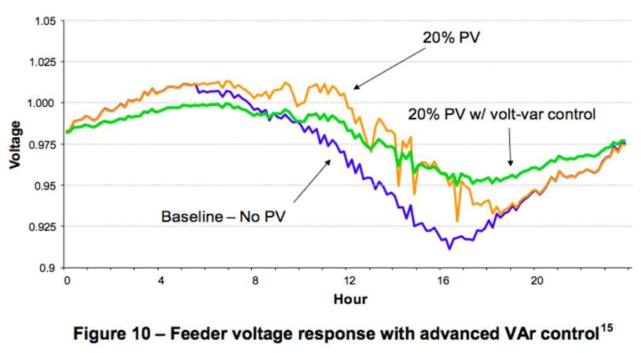 Keywords: Feeder Voltage Response with Advanced VAR Control.png en Comparison of 24 hour voltage swings on a feeder with no PV 20 PV and 20 PV with volt-VAR control 2012-02 Updating Interconnection Screens for PV System Integrationô° Michael Coddington Barry Mather Benjamin Kroposki Kevin Lynn Alvin Razon Abraham Ellis Roger Hill Tom Key Kristen Nicole and Jeff Smith other versions PD-USGov Uploaded with UploadWizard Electricity |