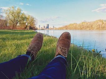 Keywords: feet shoes man legs male sitting water outdoors relaxing nature leisure footwear resting grass trees view