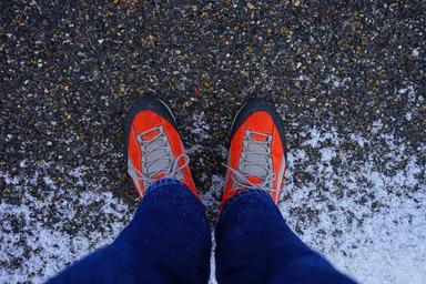 Keywords: feet stand human person shoes orange light road winter snow