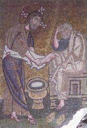 | Keywords: Feet washing (Nea Moni).jpg Christ washing the feet of Saint Peter Detail of the inner narthex mosaic Washing of the Apostles' Feet http //campus belmont edu/honors/macedonian/greece2 html century 11 nonimus Mosaics in Nea Moni of Chios Mosaics of Jesus Christ washing the feet of the apostles PD-Art |