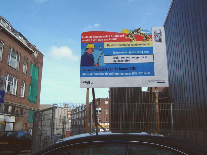 | Keywords: Feijenoord nieuwbouw 2603.jpg Plans for a new building in Feijenoord part of Rotterdam <br> Sign says At this moment we are looking at the possibilities for this location 2006-03-26 own assumed Kliek Author Vijverln Construction sites in South Holland Feijenoord |
