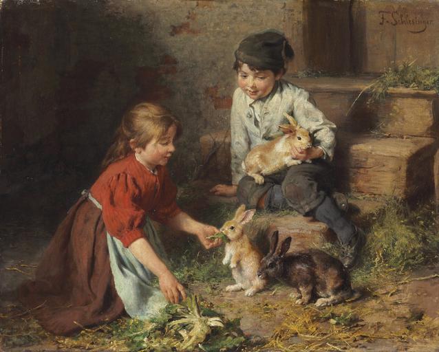 | Keywords: Felix Schlesinger - Fütterung der Kaninchen.jpg oil on canvas cm 33 40 6 accession number object history credit line F Schlesinger ~ upper right signature christies online 5127386 PD-old-auto-1923 1910 DEFAULTSORT Felix Schlesinger - Mädchen und Junge mit Kaninchen im Stall Felix Schlesinger Paintings of children with animals People with rabbits in art |