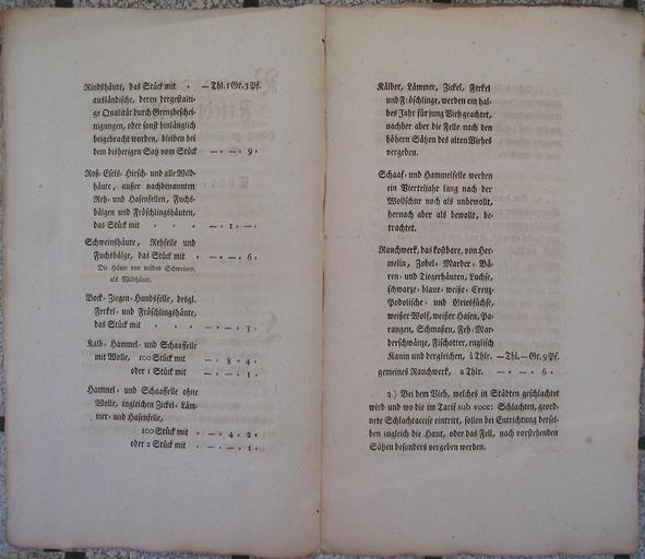 | Keywords: Fell-Tarife Friedrich August von Sachsen etc 1801 (2).jpg Preisedikt für Felle von 1801 de <br> Seite 2<br> Rindshäute das Stück mit - Thl 1 Gr 3 Pf ausländische deren dergestaltige Qualität durch Grenzbescheinigungen oder sonst hinlänglich beigebracht worden bleiben bei dem bisherigen Satz vom Stück - - 9 Roß- Esels- Hirsch- und alle Wildhäute außer nachbenannten Reh- und Hasenfellen Fuchsbälgen und Fröschlingshäuten das Stück mit - 1 - Schweinshäute Rehfelle und Fuchsbälge das Stück mit - 1 - <br> Die Häute von wilden Schweinen als Wildhäute Bock- Ziegen- Hundsfelle desgl Ferkel- und Fröschlingshäute das Stück mit - - 3 Kalb- Hammel- und Schaaffelle mit Wolle 100 Stück mit - 8 4 <br> oder 1 Stück mit - - 1 Hammel und Schaaffelle ohne Wolle ingleichen Zickel- Lämmer- und Hasenfelle 100 Stück mit - 4 2 <br> oder 2 Stück mit - - 1 Seite 3 Kälber Lämmer Ferkel und Fröschlinge werden ein halbes Jahr für jung Vieh geachtet nachher aber die Felle nach den höhern Sätzen des alten Viehes vergeben Schaaf- und Hammelfelle werden ein Vierteljahr lang nach der Wollschur noch als unbewollt hernach aber als bewollt betrachtet Rauchwerck das kostbar von Hermelin Zobel- Marder Bären und Tiegerhäuten Luchse schwarze- blaue- weiße Creuz- Podolische- Podolien Gebiet in der südwestlichen Ukraine und im nordöstlichen Moldawien und Griesfüche weißer Wolf weißer Hasen Parangen žschwarze zarte Lammfelle Schmaßen Lammfell-Schmaschen Feh- Marderschwänze Fischotter englisch Kanin und dergleichen á - Thl - Gr 9 Pf <br> gemeines Rauchwerck á Thl - - 6 2 Bei dem Vieh welches in Städten geschlachtet wird und wo die im Tarif sub voce Schlachten geordnete Schlachtaccise eintritt sollen bei Entrichtung derselben sogleich die Haut oder das Fell nach vorstehenden Sätzen gesondert vergeben werden Fortsetzung nächste Seite Collection G C Franke 1801-03-31 Friedrich August von Sachsen PD-old-100 Fell-Tarife Friedrich August von Sachsen etc 1801 2 Ausschnitt jpg <gallery> Fell-Tarife_Friedrich_August_von_Sachsen_etc_1801 1 jpg Fell-Tarife Friedrich August von Sachsen etc 1801 2 crop jpg Ausschnitt dieser Seite Rauchwerk Fell-Tarife Friedrich August von Sachsen etc 1801 2 Ausschnitt 2 jpg Ausschnitt dieser Seite Fell-Tarife_Friedrich_August_von_Sachsen_etc_1801 3 jpg Fell-Tarife_Friedrich_August_von_Sachsen_etc_1801 4 jpg </gallery> Furriers in Germany Fur wholesale dealers in Germany Domestic dog fur-skins Sheepskins Calf fur-skins Red fox fur-skins Deer skins Pony fur-skins Donkey fur-skins Hare fur-skins Goat fur-skins Sable fur-skins Marten fur-skins Bear fur-skins Cross-fox fur-skins Gray fox fur-skins Wolf fur-skins Squirrel fur-skins Rabbit fur-skins Otter fur-skins Polar fox fur-skins Collection G C Franke 1801 in Germany 1801-03-31 Fur trading values Skins 1801-03-31 Fur fashion in 1801 |