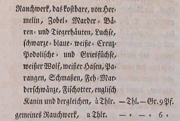| Keywords: Fell-Tarife Friedrich August von Sachsen etc 1801 (2 crop).jpg Preisedikt für Felle von 1801 Seitenausschnitt <br> Seite 3 Ausschnitt Rauchwerck das kostbar von Hermelin Zobel- Marder Bären und Tiegerhäuten Luchse schwarze- blaue- weiße Creuz- Podolische- Podolien Gebiet in der südwestlichen Ukraine und im nordöstlichen Moldawien und Griesfüche weißer Wolf weißer Hasen Parangen žschwarze zarte Lammfelle Schmaßen Lammfell-Schmaschen Feh- Marderschwänze Fischotter englisch Kanin und dergleichen á - Thl - Gr 9 Pf <br> gemeines Rauchwerck á Thl - - 6 Collection G C Franke 1801-03-31 Friedrich August von Sachsen PD-old-100 Fell-Tarife Friedrich August von Sachsen etc 1801 2 Ausschnitt jpg <gallery> Fell-Tarife_Friedrich_August_von_Sachsen_etc_1801 1 jpg Fell-Tarife Friedrich August von Sachsen etc 1801 2 jpg Fell-Tarife_Friedrich_August_von_Sachsen_etc_1801 3 jpg Fell-Tarife_Friedrich_August_von_Sachsen_etc_1801 4 jpg </gallery> Furriers in Germany Fur wholesale dealers in Germany Domestic dog fur-skins Sheepskins Calf fur-skins Red fox fur-skins Deer skins Pony fur-skins Donkey fur-skins Hare fur-skins Goat fur-skins Sable fur-skins Marten fur-skins Bear fur-skins Cross-fox fur-skins Gray fox fur-skins Wolf fur-skins Squirrel fur-skins Rabbit fur-skins Otter fur-skins Polar fox fur-skins Collection G C Franke 1801 in Germany 1801-03-31 Fur trading values Skins 1801-03-31 Fur fashion in 1801 |