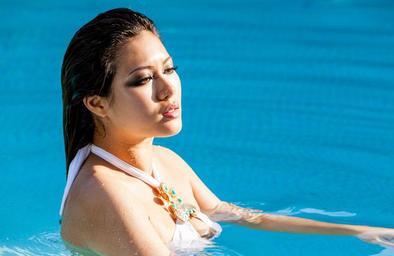 Keywords: female attractive white bikini eurasian young woman girl person healthy sexy body slim face workout water swimming pool necklace
