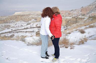 Keywords: female couple friends red white winter nature snow frozen ice sky winter mood landscape mountains cappadocia