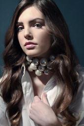 Keywords: female fashion model beauty white shirt pearl necklace young attractive long hair brunette make up studio portrait elegant stylish gorgeous cute hairstyle vogue editorial commercial confident wavy hair photography modelling