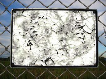 Keywords: fence meadow shield board crack old broken break up trace paint scratches injury cracked brittle sign