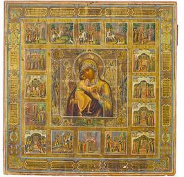 | Keywords: Feodorovskaya with miracles from Elizavetin's collection.jpeg Феодо овская икона Божией ате и с чудесами Конец XIX начало ХХ века Владими ские иконописные села Де ево левкас темпе а 42 5 х 42 3 см Соб ание д евней усской иконописи Е Елизаветина Клейма Св Феодо Ст атилат п иносит икону Богомате и в Кост ому Явление иконы кост омскому князю Василию Квашне во в емя охоты Князь Василий пытается снять икону с де ева и молится пе ед иконой Князь Василий вто ично пытается снять икону Князь вместе с духовенством п иходит к месту явления иконы П инесение иконы в Кост ому Поставление иконы в собо ной це кви олебен и исцеления от иконы Жители Го одца узнают свою чудотво ную икону Об етение иконы нев едимой после пожа а Поставление иконы в новой собо ной це кви оление пе ед иконой о защите Кост омы от тата Ослепление тата ского войска сиянием от иконы Спасение иконы вознесением на небеса п и вто ом пожа е собо ной це кви Поклонение иконе Поставление иконы в каменном собо ном х аме http //www cirota ru/forum/images/107/107091 jpeg century 19 author PD-Art Feodorovskaya with miracles |