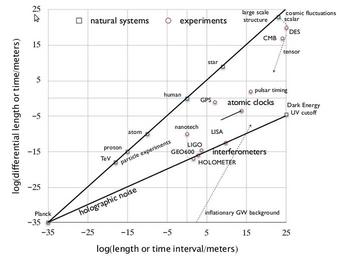 | Keywords: Fermi National Accelerator Laboratory - Holographic Noise Chart.png graph en This plot shows the sensitivity of various experiments to fluctuations in space and time Horizontal axis is the log of apparatus size or duration time the speed of light in meters; vertical axis is the log of the rms fluctuation amplitude in the same units The lower left corner represents the Planck length or time In these units the size of the observable universe is about 26 Various physical systems and experiments are plotted The holographic noise line represents the rms transverse holographic fluctuation amplitude on a given scale The most sensitive experiments are Michelson interferometers http //holometer fnal gov/ Fermi National Accelerator Laboratory Craig Hogan 2010-10-04 PD-USGov Noise physics Astrophysics Unidentified graphs |