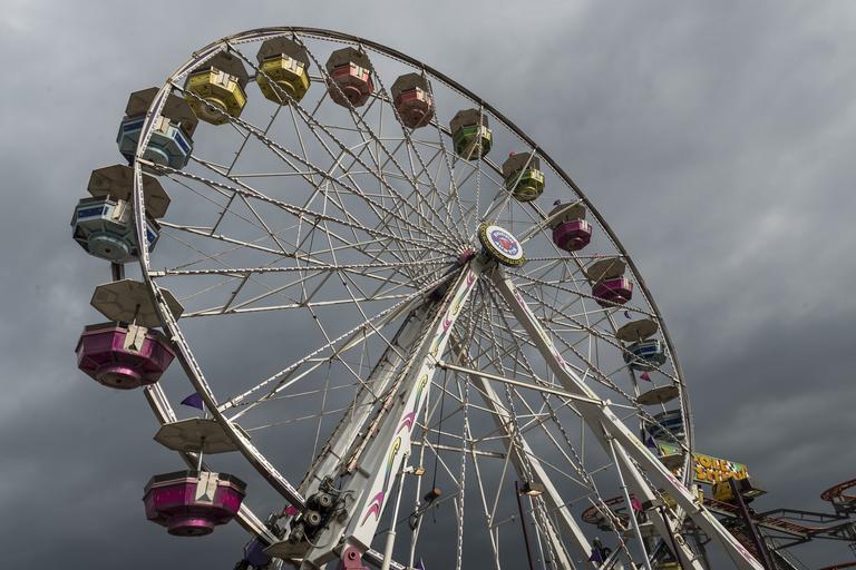 Keywords: ferris wheel thrilling fun entertainment recreation excitement joy fairground high ride outdoors attraction evening