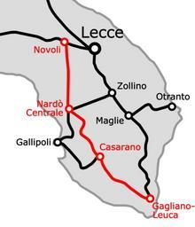Keywords: Ferrovia Novoli-Gagliano.png it Tracciato della ferrovia Novoli - Gagliano del Capo delle Ferrovie del Sud Est own Friedrichstrasse 2009-05-10 Rail transport maps of Apulia Novoli-Gagliano Novoli-Gagliano del Capo railway