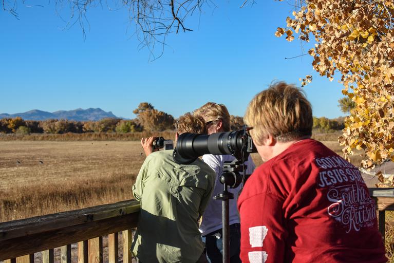 Keywords: Visitors observe and photograph Sandhill Cranes in the field from Willow Deck. Jessie Jobs/USFWS