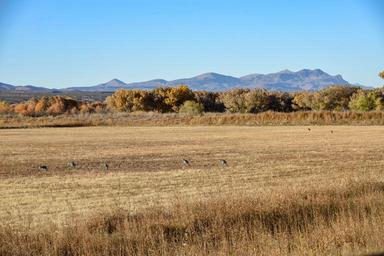 Keywords: View of Sandhill Cranes in the field from Willow Deck. Jessie Jobs/USFWS