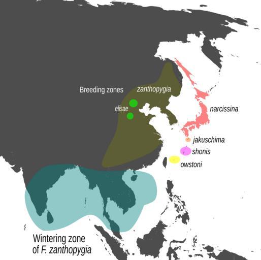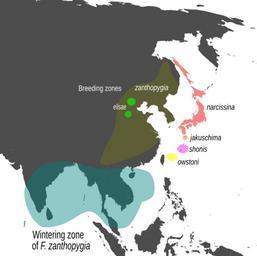 | Keywords: FicedulaZanthopygiaMap.svg en Map showing breeding range of Ficedula zanthopygia F narcissina and F elisae based on T Töpfer Zoologische Mededelingen Leiden 80-5 december 2006 Systematic notes on Asian birds 60 Remarks on the systematic position of Ficedula elisae Weigold 1922 - also indicated wintering zone of zanthopygia own L Shyamal 2009-01 Ficedula zanthopygia Ficedula narcissina | ||||