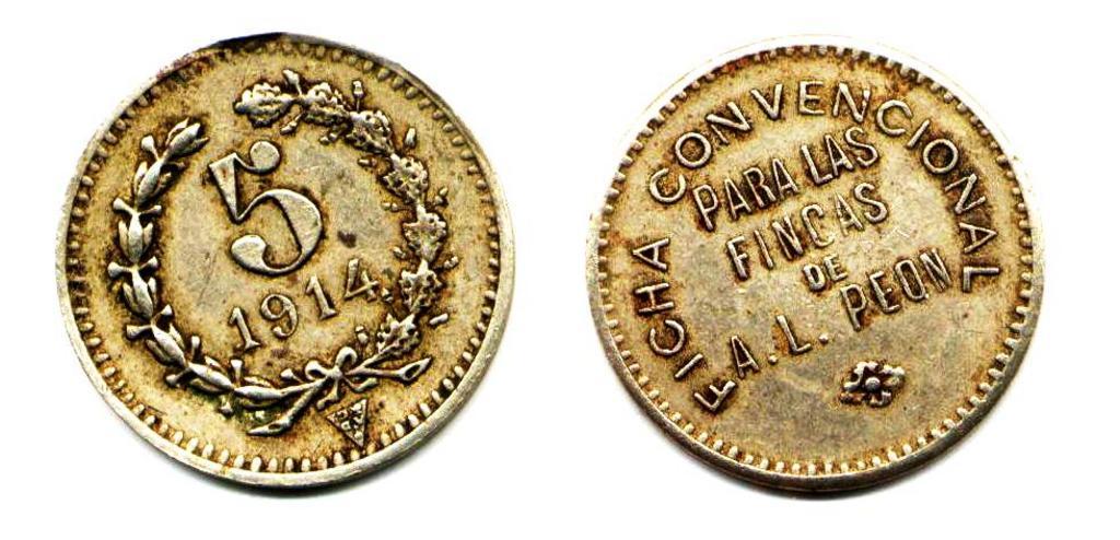 View Original:Ficha por $ 0.05 de las fincas de Agusto L. Peón de 1914, Yucatán (01)(anverso y reverso).jpg (980x473)