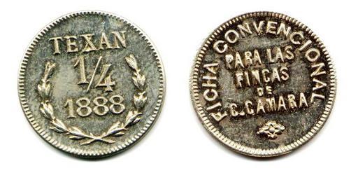 | Keywords: Ficha por cuarto real de la Hacienda Texán Cámara, Yucatán de 1888 (01)(anverso y reverso).jpg es Ficha por cuarto real de la Hacienda Texán Cámara Yucatán 2013-08-06 12 59 45 own Inri PD-Mexico cc-zero Uploaded with UploadWizard Coins of Mexico |
