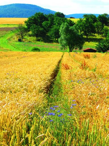 Keywords: field cereals cornflowers summer landscape agriculture cornfield blue blossom bloom plant ear golden yellow